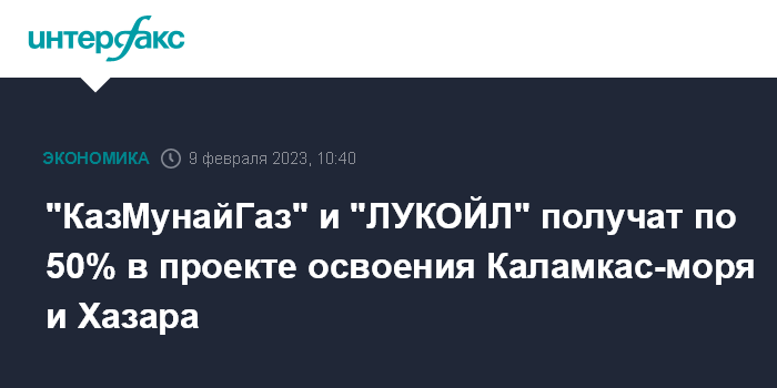 Москва. 9 февраля. INTERFAX.RU - Казахстанская национальная нефтегазовая компания "КазМунайГаз" (КМГ) и российский "ЛУКОЙЛ" поровну разделят доли в проекте освоения месторождений Каламкас-море и Хазар, расположенных в казахстанском секторе Каспийского моря, сообщила пресс-служба КМГ.