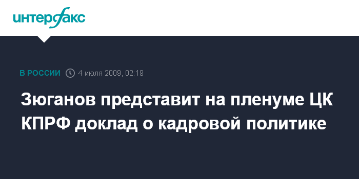 Москва. 4 июля. ИНТЕРФАКС - Лидер КПРФ Геннадий Зюганов на предстоящем в субботу пленуме компартии выступит с докладом "О работе с кадрами в современных условиях".