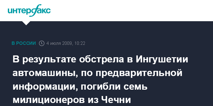 Москва. 4 июля. INTERFAX.RU - В результате обстрела в селении Аршты Сунженского района Ингушетии, по предварительной информации, погибли семь сотрудников милиции из Чеченской республики, несколько человек получили ранения.