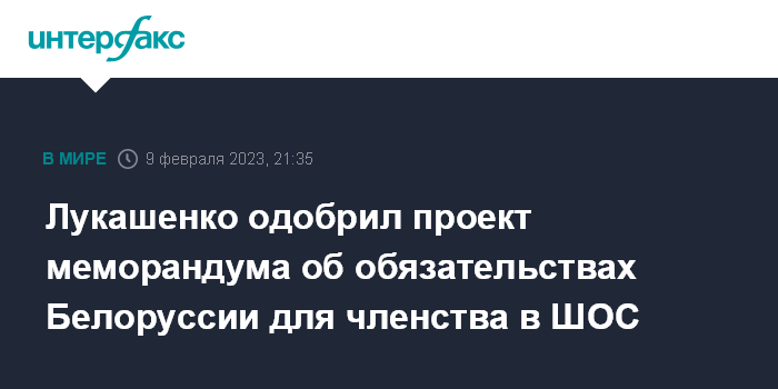 Москва. 9 февраля. INTERFAX.RU - Президент Белоруссии Александр Лукашенко в четверг подписал указ №31, которым одобрен проект меморандума об обязательствах Белоруссии в целях получения статуса государства-члена Шанхайской организации сотрудничества (ШОС), сообщила президентская пресс-служба.