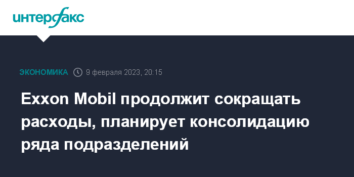 Москва. 9 февраля. INTERFAX.RU - Крупнейшая нефтегазовая компания США Exxon Mobil Corp. намерена объединить ряд подразделений, продолжая реорганизацию, которая должна привести к снижению расходов и сокращению части рабочих мест.