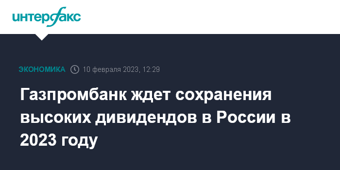 Москва. 10 февраля. INTERFAX.RU - Газпромбанк ожидает сохранения высокого уровня дивидендных выплат на российском рынке в 2023 году, говорится в обзоре департамента анализа рыночной конъюнктуры банка.