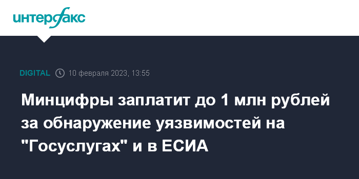 Москва. 10 февраля. INTERFAX.RU - Минцифры объявило, что запустило программу bug bounty (выплата вознаграждения за обнаружение уязвимостей) для поиска "тонких мест" в двух госинформсистемах - на портале Госуслуг и в Единой системе идентификации и аутентификации (ЕСИА).