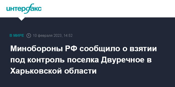 Москва. 10 февраля. INTERFAX.RU - Российские военные взяли под контроль населенный пункт Двуречное в Харьковской области, заявил официальный представитель Минобороны РФ Игорь Конашенков.