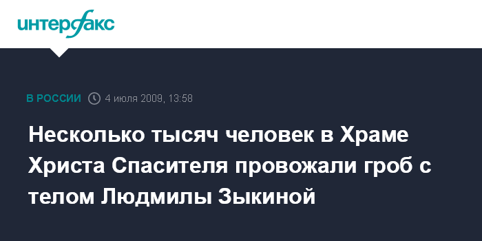 Москва. 4 июля. INTERFAX.RU - Катафалк с гробом народной артистки СССР Людмилы Зыкиной возле Храма Христа Спасителя провожали аплодисментами несколько тысяч человек.