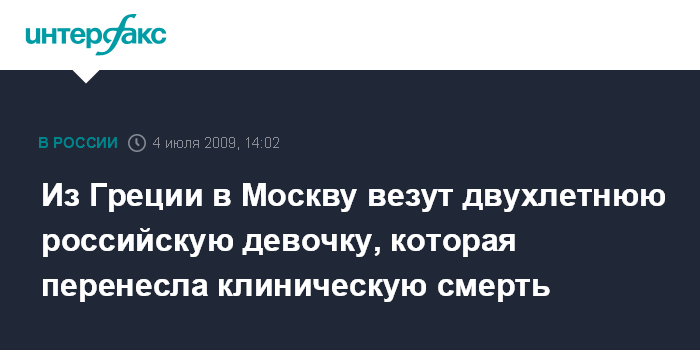 Москва. 4 июля. INTERFAX.RU - Самолет санитарной авиации экстренно доставит из Греции в Москву маленькую российскую туристку, которая перенесла клиническую смерть, сообщила "Интерфаксу" пресс-секретарь Российского союза туриндустрии Ирина Тюрина в субботу.