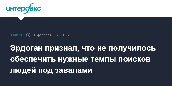 Москва. 10 февраля. INTERFAX.RU - Президент Турции Реджеп Тайип Эрдоган признал, что правительство не смогло так быстро решить вопрос с преодолением последствий разрушительного землетрясения и разбором завалов, как хотелось бы. Как пишет Hurriyet, он заявил об этом в городе Адыяман.