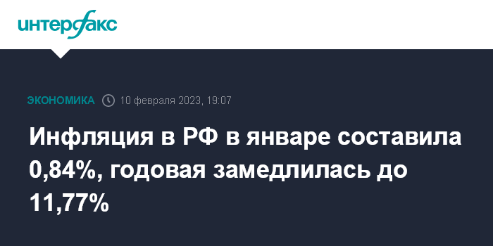 Годовая инфляция, по данным Росстата, в январе замедлилась до 11,77% (аналитики прогнозировали около 11,6%) с 11,94% на конец декабря, 11,98% на конец ноября, 12,63% на конец октября, 13,68% на конец сентября, 14,30% на конец августа, 15,10% в июле, 15,90% в июне, 17,10% в мае и 17,83% в апреле (это был максимум с января 2002 года).