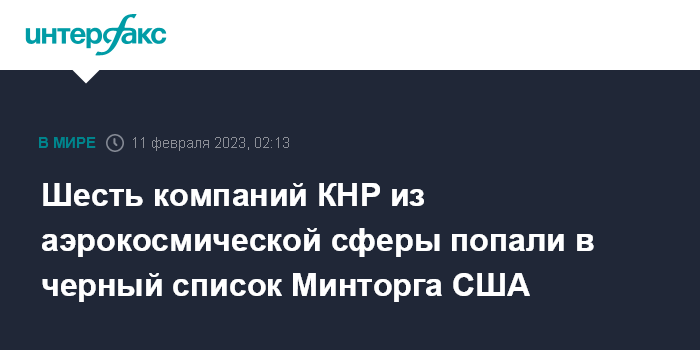 Москва. 11 февраля. INTERFAX.RU - Министерство торговли США внесло в черный список шесть китайских компаний, связанных с аэрокосмической отраслью, сообщат телеканал CNBC.