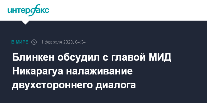 Москва. 11 февраля. INTERFAX.RU - Госсекретарь США Энтони Блинкен в телефонном разговоре с министром иностранных дел Никарагуа Денисом Монкадой заявил о важности налаживания конструктивного диалога между двумя странами, сообщил американский госдепартамент.