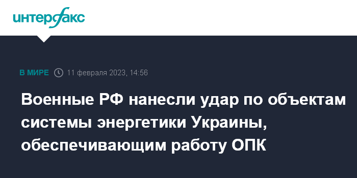 Москва. 11 февраля. INTERFAX.RU - Российские военные накануне нанесли массированный ракетный удар по объектам системы энергетики, обеспечивающим функционирование предприятий ОПК и транспорта Украины, заявили в Минобороны РФ.