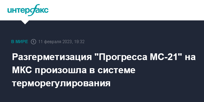 Москва. 11 февраля. INTERFAX.RU - Утечка охлаждающей жидкости из системы терморегулирования корабля "Прогресс МС-21", пристыкованного к Международной космической станции (МКС), остановилась, весь хладагент вытек, следует из переговоров экипажа станции с Центром управления полетами в Хьюстоне.