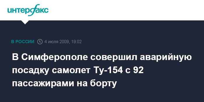 Москва. 4 июля. INTERFAX.RU - В аэропорту Симферополя около 16:00 по местному времени (17:00 мск) в субботу совершил аварийную посадку самолет Ту-154 с 92 пассажирами на борту.