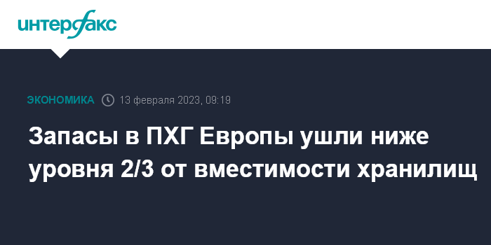 Москва. 13 февраля. INTERFAX.RU - Уровень запасов в подземных хранилищах Европы по итогам завершившегося похолодания ушел ниже уровня 2/3 от их вместимости.