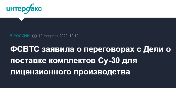 Москва. 13 февраля. INTERFAX.RU - Москва и Дели ведут контрактные переговоры о поставке комплектов истребителей Су-30МКИ для лицензионного производства в Индии, сообщил "Интерфаксу" замглавы Федеральной службы по военно-техническому сотрудничеству (ФСВТС) России Владимир Дрожжов в ходе выставки Aero India 2023.