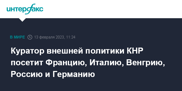 "Ван И с 14 по 22 февраля совершит визит во Францию, Италию, Венгрию и Россию, он также посетит 59-ю Мюнхенскую конференцию по безопасности в Германии", - приводит телеканал слова представителя китайского внешнеполитического ведомства Вана Вэньбина.