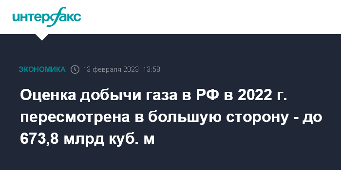 Москва. 13 февраля. INTERFAX.RU - Оценка добычи газа в России в 2022 году в очередной раз пересмотрена - в бОльшую сторону - до 673,8 млрд куб. м. Новые данные сообщил вице-премьер РФ Александр Новак в статье журнала "Энергетическая политика".