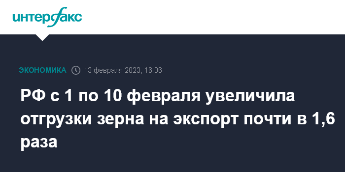 РФ с 1 по 10 февраля увеличила отгрузки зерна на экспорт почти в 1,6 раза