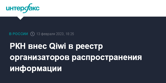 Москва. 13 февраля. INTERFAX.RU - Роскомнадзор внес в реестр организаторов распространения информации сайт электронной платежной системы Qiwi, следует из данных на сайте реестра.