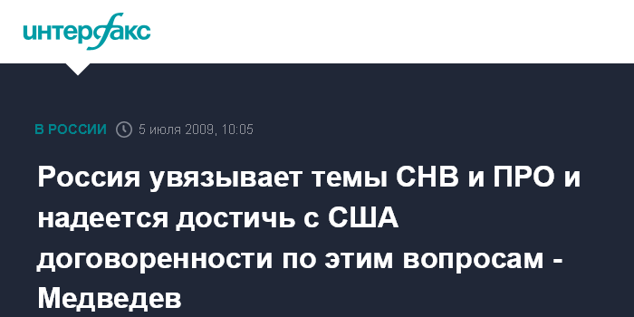 "Да, мы считаем, что эти темы взаимосвязаны, и по понятным причинам, потому как наступательные ядерные потенциалы, они существуют не сами по себе, а во взаимоувязке с теми средствами, которые существуют для их перекрытия, - средствами противоракетной обороны", - сказал Д.Медведев в интервью итальянским СМИ.