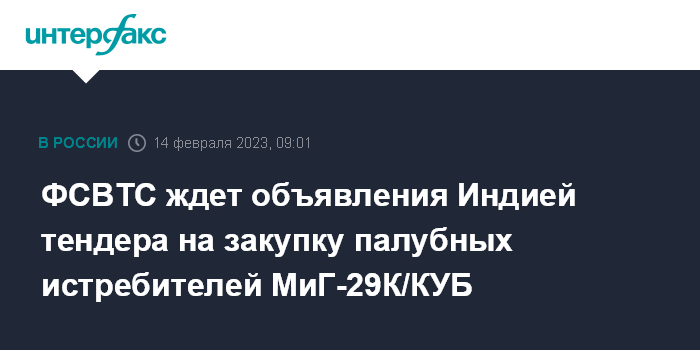 Москва. 14 февраля. INTERFAX.RU - Россия ожидает, когда Индия объявит тендер для покупки новой партии корабельных истребителей МиГ-29К/КУБ для оснащения авианосцев, сообщил "Интерфаксу" замглавы Федеральной службы по военно-техническому сотрудничеству (ФСВТС) Владимир Дрожжов.