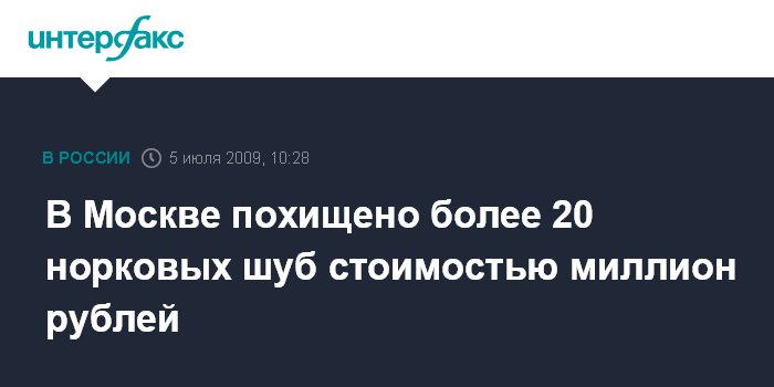 Москва. 5 июля. INTERFAX.RU - На северо-западе Москвы грабители похитили 21 норковую шубу, сообщил "Интерфаксу" источник в правоохранительных органах в воскресенье.
