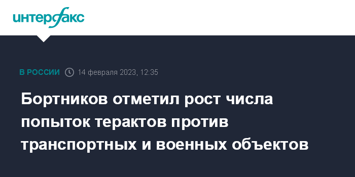 Москва. 14 февраля. INTERFAX.RU - За время проведения специальной военной операции существенно возросло число террористических посягательств со стороны украинских спецслужб и националистических формирований при поддержке коллективного Запада на транспортные, энергетические военные и административные объекты в России, заявил директор ФСБ, председатель Национального антитеррористического комитета Александр Бортников.