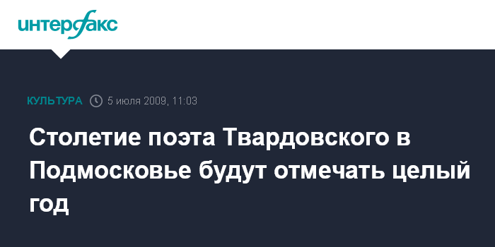 Красногорск (Подмосковье). 5 июля. INTERFAX.RU - Празднование столетия поэта Александра Твардовского в Московской области будет длиться с лета 2009 года по июнь 2010, сообщили "Интерфаксу" в Минпечати Подмосковья.