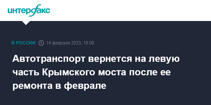 Москва. 14 февраля. INTERFAX.RU - Восстановленную после взрыва левую автодорожную часть Крымского моста откроют для движения легкового транспорта и автобусов в феврале, сообщила пресс-служба Росавтодора и добавила, что восстановительные работы на мосту почти завершены.