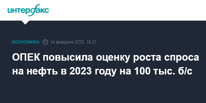 Москва. 14 февраля. INTERFAX.RU - ОПЕК повысила оценку спроса на нефть в 2023 году на 100 тысяч баррелей в сутки - до 101,87 млн б/с, говорится в ежемесячном отчете организации.