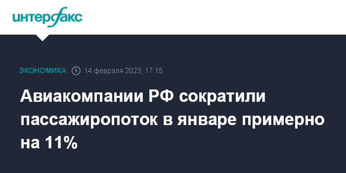 Москва. 14 февраля. INTERFAX.RU - Пассажиропоток российских авиакомпаний в январе 2023 года, по оперативным данным Росавиации, сократился примерно на 11% относительно января 2022 года, сообщил глава ведомства Александр Нерадько.