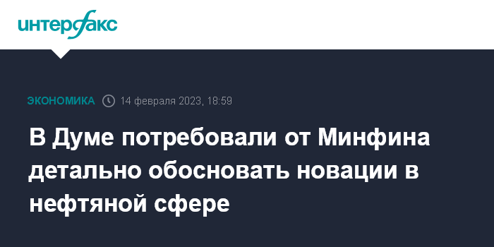 Москва. 14 февраля. INTERFAX.RU - Госдума до 16 февраля ждет от Минфина детальное финансово-экономическое обоснование предложенных в субботу правительством новаций в нефтяной сфере, заявил глава думского комитета по бюджету Андрей Макаров. Речь идет прежде всего о возможных выпадающих доходах регионов по налогу на прибыль.