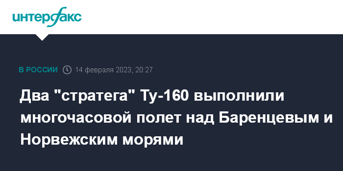 Москва. 14 февраля. INTERFAX.RU - Два российских стратегических ракетоносца Ту-160 выполнили многочасовой полет над нейтральными водами Баренцева и Норвежского морей, сообщили в Минобороны РФ во вторник.