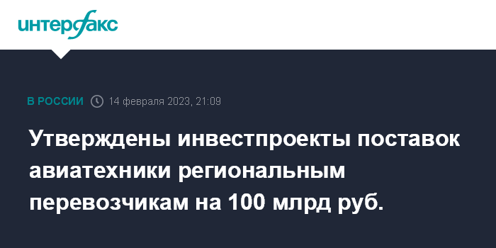 Москва. 14 февраля. INTERFAX.RU - Правительство РФ утвердило паспорта инвестиционных проектов по поставке региональным авиакомпаниям самолетов и вертолетов общей стоимостью почти 100 млрд руб.