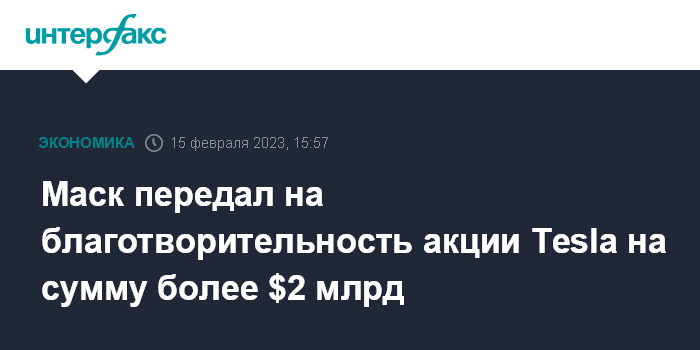 Москва. 15 февраля. INTERFAX.RU - Американский миллиардер Илон Маск пожертвовал около 12 млн акций возглавляемой им компании Tesla Inc. на благотворительность в 2022 году, говорится в документах, направленных в Комиссию по ценным бумагам и биржам (SEC) США.