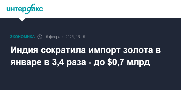 Москва. 15 февраля. INTERFAX.RU - В январе 2023 года Индия импортировала золото всего на $697 млн, следует из материалов Министерства торговли и промышленности страны.