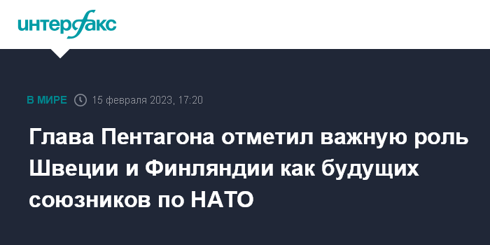 Москва. 15 февраля. INTERFAX.RU - Министр обороны США Ллойд Остин в среду заявил, что пока не может точно сказать, когда Швеция и Финляндия станут членами НАТО, но отметил их важную роль как будущих союзников.