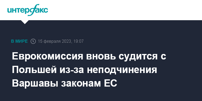 Москва. 15 февраля. INTERFAX.RU - Европейская комиссия (ЕК) объявила в среду о решении обратиться в Суд Европейского союза в связи с нарушением законодательства ЕС польским Конституционным судом и его прецедентной практикой.