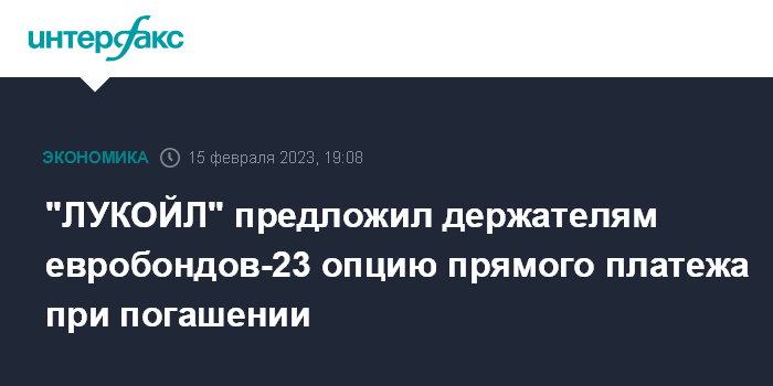 Москва. 15 февраля. INTERFAX.RU - "ЛУКОЙЛ" предложил держателям долларовых еврооблигаций компании с погашением в апреле 2023 года воспользоваться вариантом прямого платежа при погашении этого выпуска.