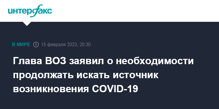 Москва. 15 февраля. INTERFAX.RU - Гендиректор Всемирной организации здравоохранения (ВОЗ) Тедрос Адханом Гебрейесус заявил, что твердо намерен продолжать попытки установить происхождение коронавируса COVID-19.