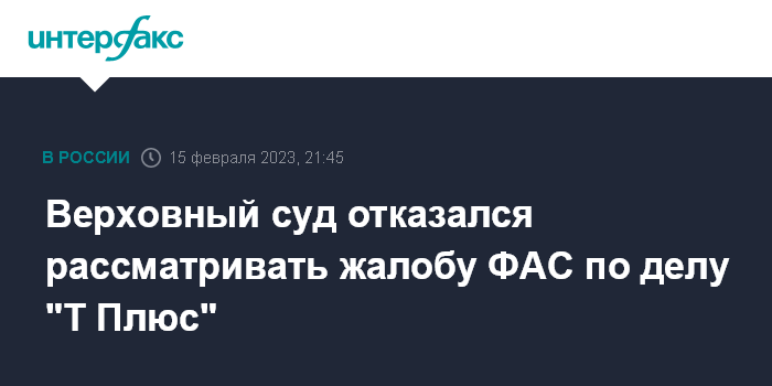 Москва. 15 февраля. INTERFAX.RU - Верховный суд РФ отказался рассматривать кассационную жалобу ФАС России на решения нижестоящих инстанций в судебном споре с ПАО "Т Плюс", следует из картотеки арбитражных дел.