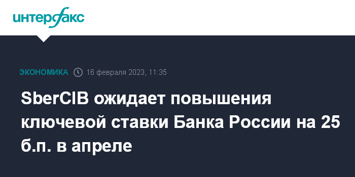 Москва. 16 февраля. INTERFAX.RU - SberCIB Investment Research ожидает повышения ключевой ставки Банка России на 25 базисных пунктов в апреле, говорится в комментарии инвестбанка.