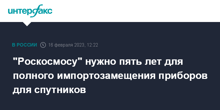 Москва. 16 февраля. INTERFAX.RU - России потребуется до пяти лет, чтобы полностью заменить иностранную бортовую аппаратуру на отечественных спутниках, заявил на конференции Satellite Russia 2023 советник генерального директора "Роскосмоса" Николай Севостьянов.