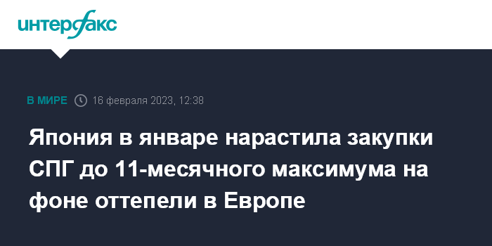 Москва. 16 февраля. INTERFAX.RU - Япония, крупнейший мировой покупатель СПГ, в январе импортировала максимальный объем сжиженного природного газа за последние 11 месяцев (с февраля 2022 года).