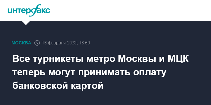 Москва. 16 февраля. INTERFAX.RU - В столице все турникеты в метро и на Московском центральном кольце (МЦК) теперь могут принимать оплату проезда банковской картой, сообщил мэр Москвы Сергей Собянин.