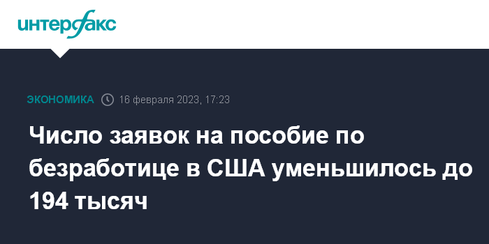 Москва. 16 февраля. INTERFAX.RU - Количество американцев, впервые обратившихся за пособием по безработице, на прошлой неделе уменьшилось на 1 тысячу - до 194 тысяч человек, сообщило Министерство труда США.