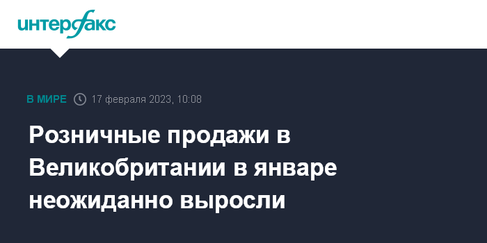Москва. 17 февраля. INTERFAX.RU - Розничные продажи в Великобритании в январе выросли на 0,5% по сравнению с предыдущим месяцем. Об этом свидетельствуют данные Национального статистического управления (ONS) страны.