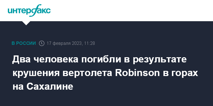 Москва. 17 февраля. INTERFAX.RU - Пилот и пассажирка частного вертолета Robinson, совершившего аварийную посадку в горах недалеко от Южно-Сахалинска, погибли, сообщает областное агентство по делам гражданской обороны и чрезвычайным ситуациям.