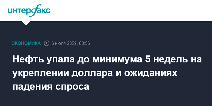 Москва. 6 июля. INTERFAX.RU - Нефть упала до минимума 5 недель на укреплении курса доллара США относительно других мировых валют и на ожиданиях падения спроса на топливо из-за рецессии, сообщило агентство Bloomberg.