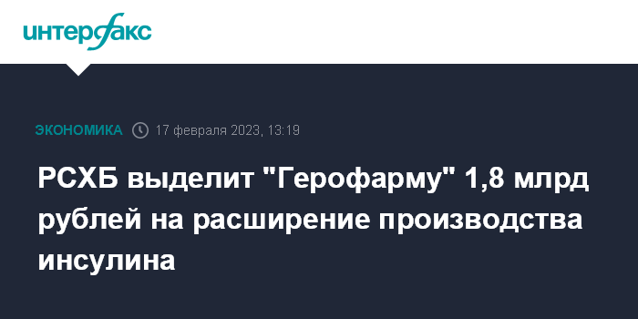 Москва. 17 февраля. INTERFAX.RU - Фармацевтическая компания "Герофарм" привлекла заем Россельхозбанка на сумму 1,8 млрд рублей для расширения производства лекарственных средств, в том числе инсулина.